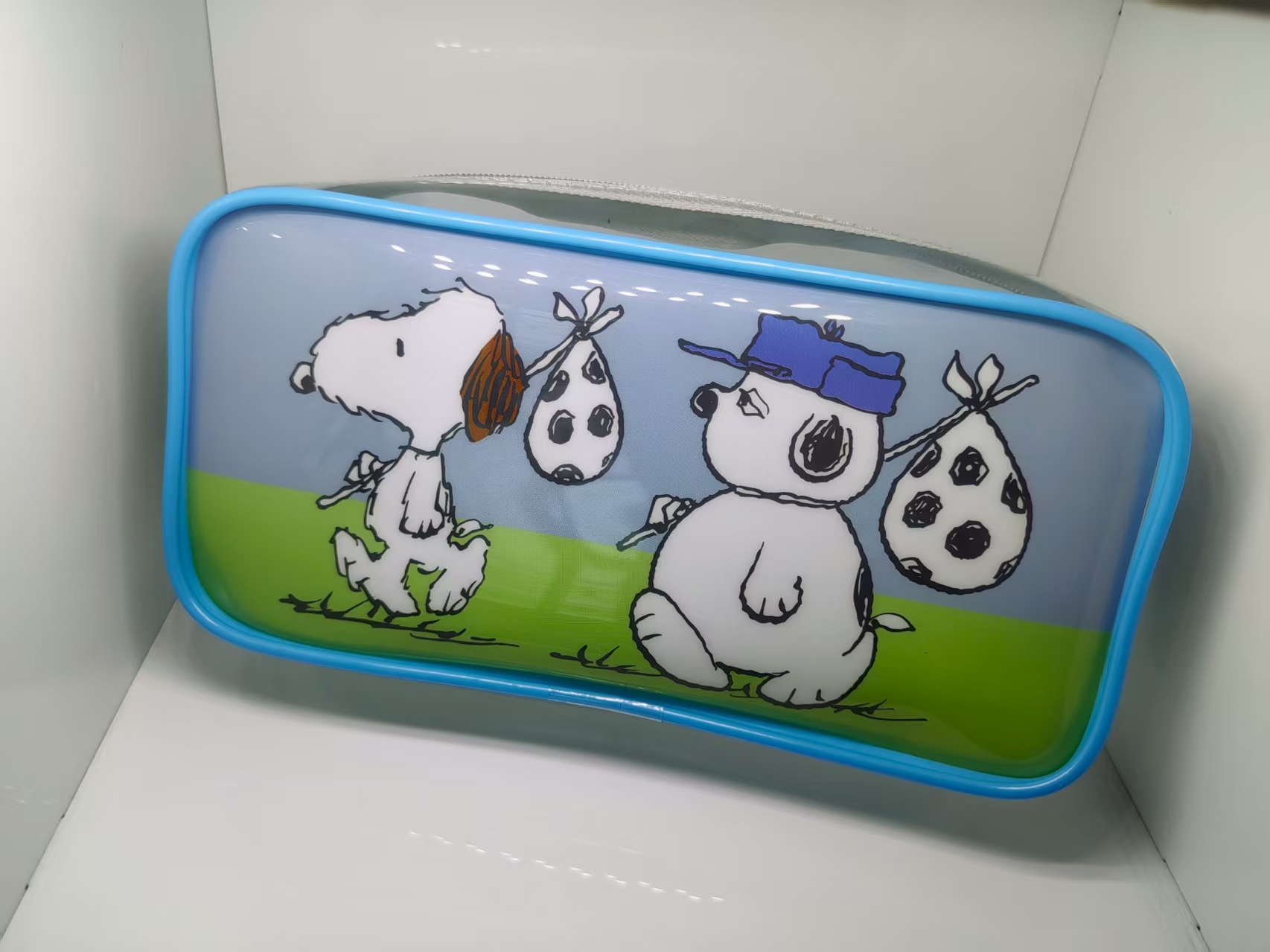 This pencil case features vivid illustrations of Snoopy and his friend, bringing the beloved Peanuts characters to life. The design showcases a bright blue border that contrasts beautifully with the soft blue and green background, making the cartoon figures pop. Crafted with durable materials, it’s built to withstand daily use at school or home. The spacious interior provides ample room for pencils, pens, erasers, and other stationery essentials, keeping your supplies organized and easily accessible.