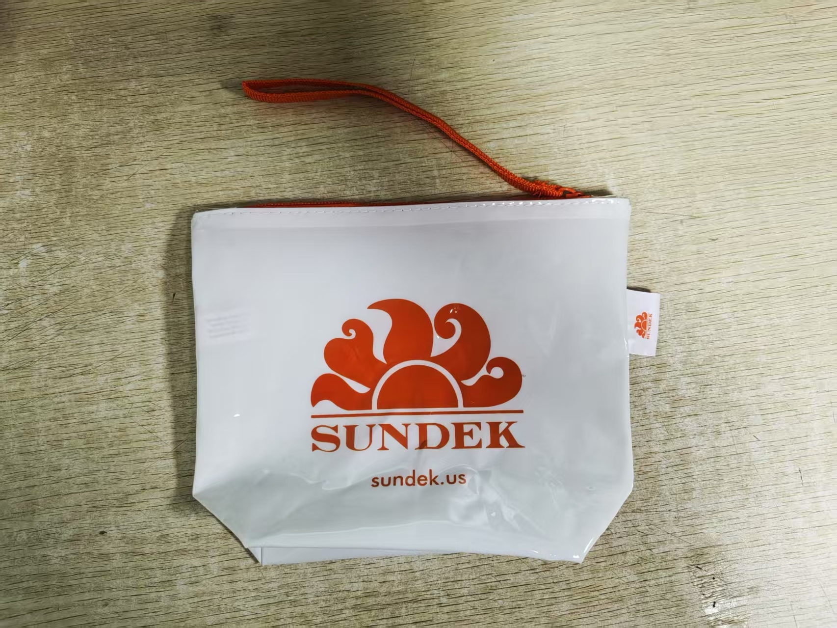 Discover our premium transparent PVC pouch, designed to elevate your organization game with both style and practicality. Made from robust PVC material, this pouch boasts a bright orange zipper and wrist strap for effortless accessibility and portability. Its clear construction lets you instantly identify contents, while customizable printing (just like the displayed “SUNDEK” logo) makes it a stellar choice for branding or personalization.