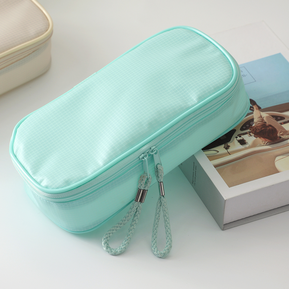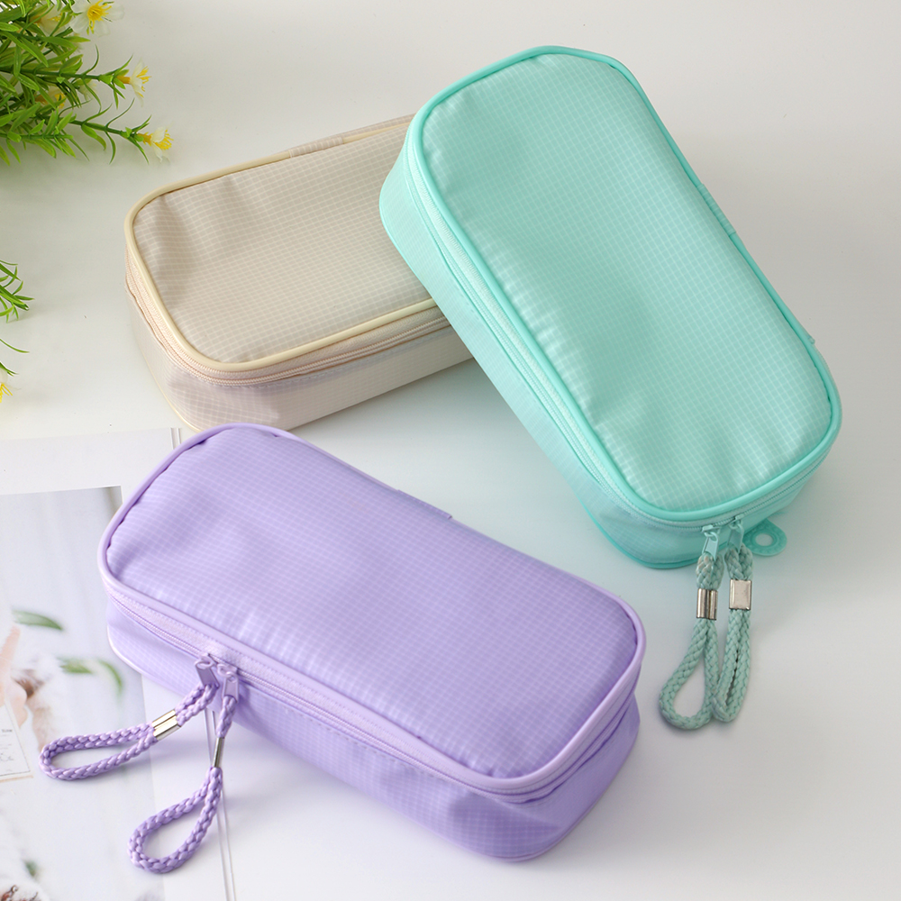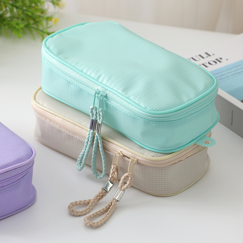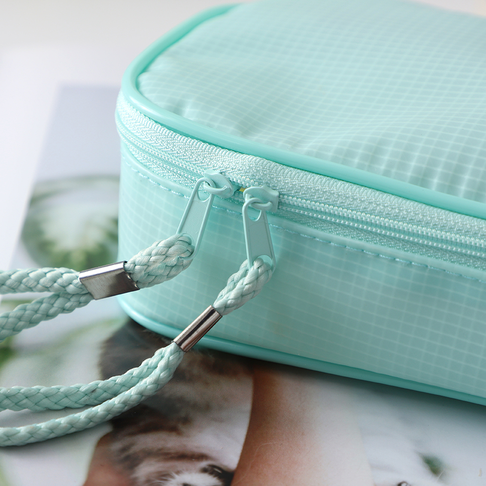 Style Design: Multiple colors available (mint green/light purple/beige), double zipper closure + braided lanyard for easy portability, suitable for storing cosmetics, stationery, travel gadgets, etc.;